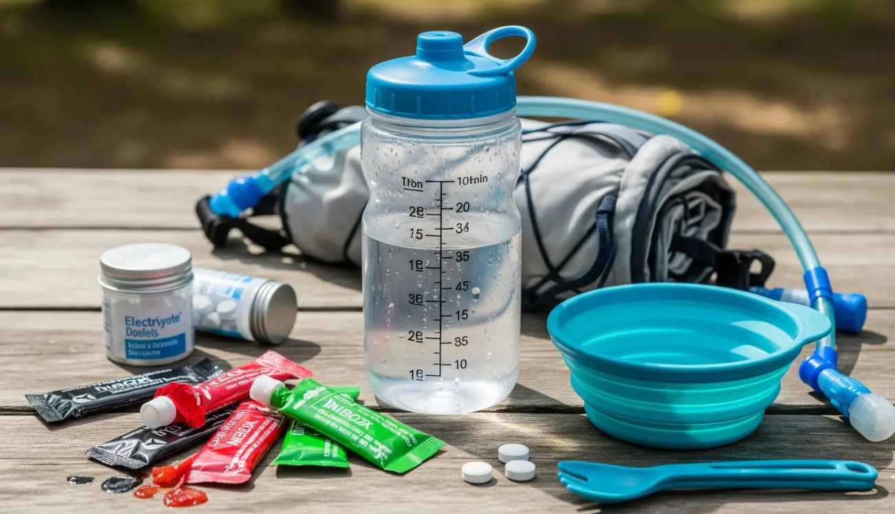 | Hydration & Snacks | Reusable water bottle, water filter, protein bars, dried fruit, electrolyte packets |