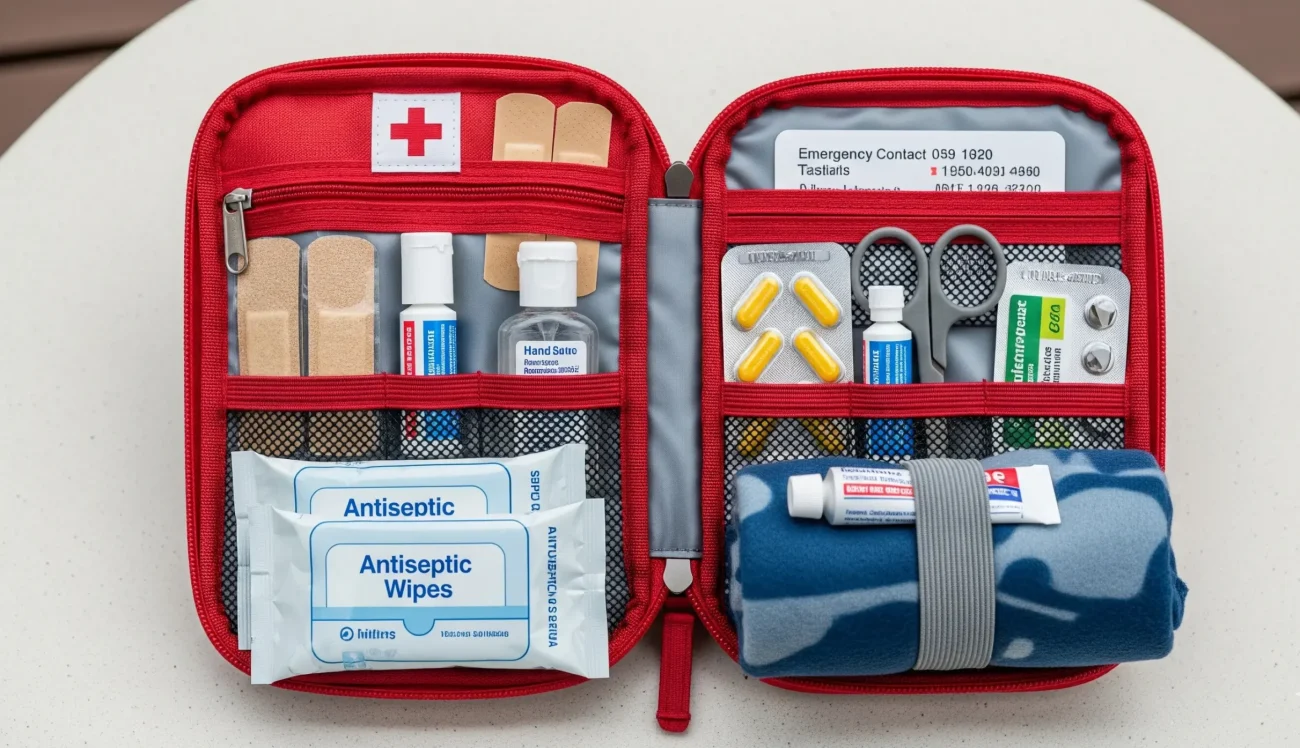 | Health & First-Aid | Band-aids, antiseptic wipes, pain relievers, antihistamines, prescription meds, electrolyte tablets, heat rash cream |